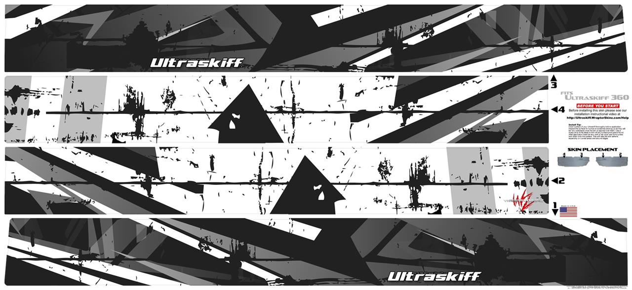 WraptorSkinz® skin wraps for Ultraskiff 360 are printed using superb photo quality designs and vibrant colors printed with special fade resistant inks that last even in direct sun for years. WraptorSkinz® are a composite of two layers of commercial grade materials. The bottom layer is a soft, flexible material with a special ultra-sticky adhesive designed to adhere to plastic body of the Ultraskiff. Next we print the bottom layer with UV protected, fade resistant inks that deliver superb photo quality designs in vibrant colors. Finally we bond a professional grade laminate over the entire skin adding a glossy protective finish.
