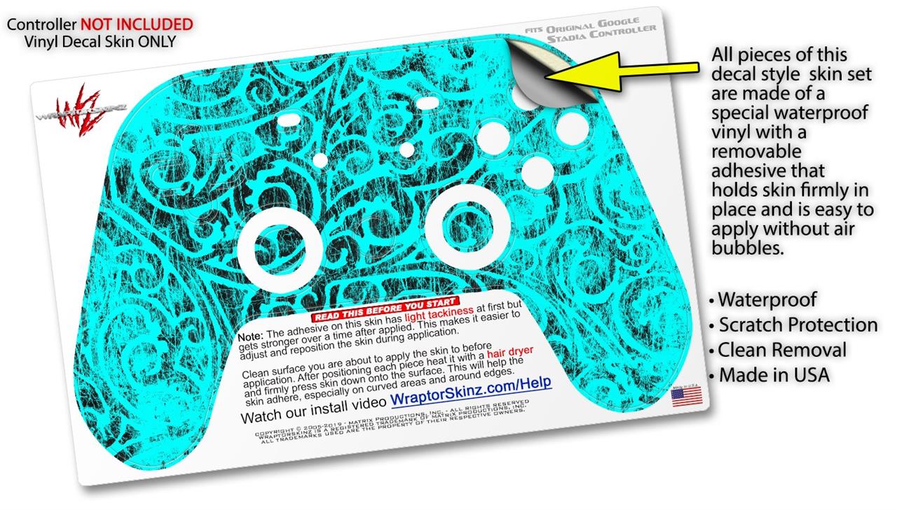 This product is in no way affiliated with or endorsed by Google. WraptorSkinz® skin wraps work with the Original Google Stadia version 1 Controller. Printed using superb photo quality designs and vibrant colors printed with special fade resistant inks that last even in direct sun for years. WraptorSkinz are a composite of two layers of commercial grade materials. The bottom layer is a soft, flexible vinyl with a special removable adhesive that is easily positioned, applied without air bubbles. Next, we print the bottom layer with UV protected, fade resistant inks that deliver superb photo quality designs in vibrant colors. Finally, we bond a professional grade laminate over the entire skin adding a glossy protective finish.