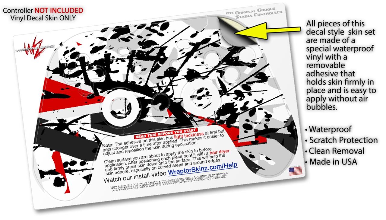 This product is in no way affiliated with or endorsed by Google. WraptorSkinz® skin wraps work with the Original Google Stadia version 1 Controller. Printed using superb photo quality designs and vibrant colors printed with special fade resistant inks that last even in direct sun for years. WraptorSkinz are a composite of two layers of commercial grade materials. The bottom layer is a soft, flexible vinyl with a special removable adhesive that is easily positioned, applied without air bubbles. Next, we print the bottom layer with UV protected, fade resistant inks that deliver superb photo quality designs in vibrant colors. Finally, we bond a professional grade laminate over the entire skin adding a glossy protective finish.