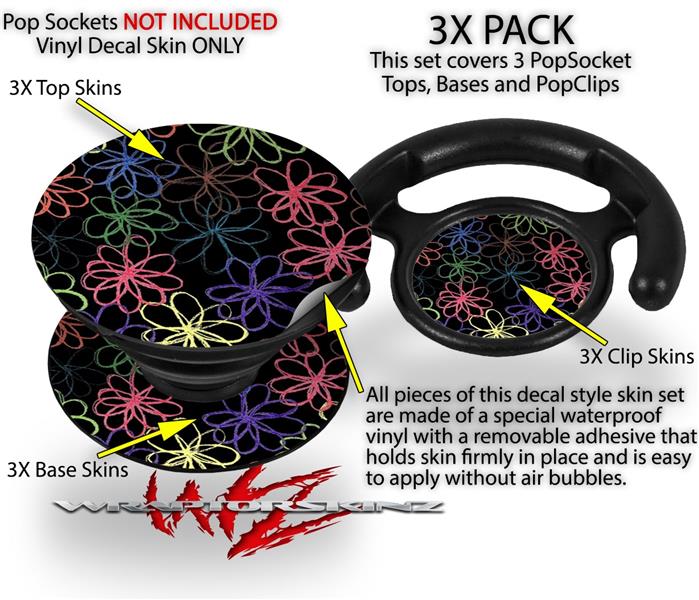 Decal Style Vinyl Skin Wrap 3 Pack for PopSockets Kearas Flowers on Black (POPSOCKET NOT INCLUDED)